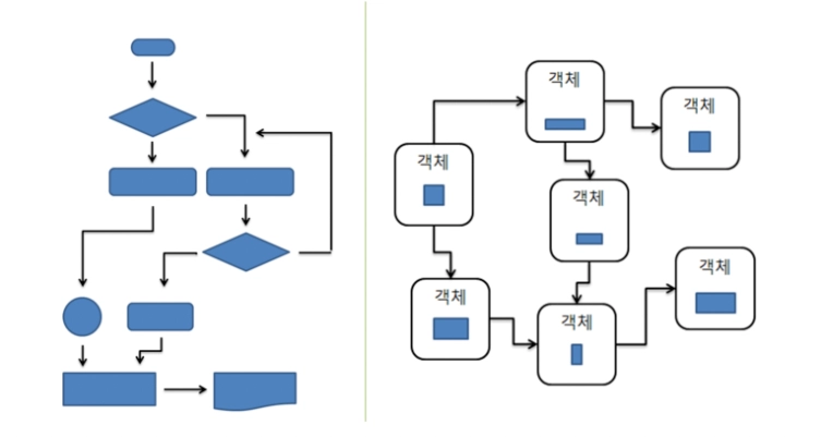 원래 프로그래밍은 절차지향적인 프로그래밍이었다 절차지향은 프로그램 전체가 유기적으로 연결되있어서 프로그램의 실행속도가 빠르지만 유지보수가 어렵고 순서를 바꾸지 못하기때문에 비효율적이었다