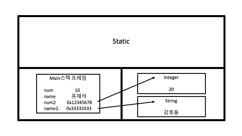 그림에서보면 num과 name은 Stack영역에 바로 데이터가 저장되지만