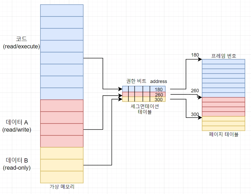 서로 관련 있는 영역의 페이지들을 하나의 세그먼트로 묶어서 세그먼테이션 테이블로 관리하고, 페이지는 페이지 테이블로 관리한다.