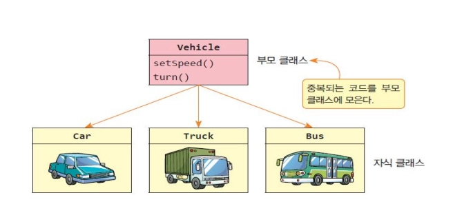 위와 같이 중복되는 코드를 Vehicle이라는 부모 클래스에 정의하고, Car, Truck, Bus를 Vehicle을 상속받는 서브 클래스로 만들어줌으로써, 상속받아 서브 클래스의 상황에 맞게 구현하도록 한다.