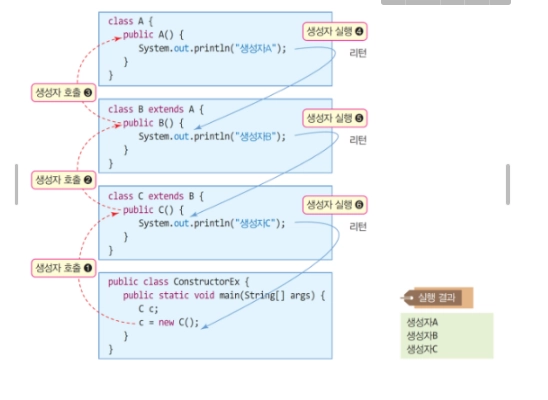 따라서, 자식 클래스 안의 부모 클래스 부분을 초기화 하기 위해 부모 클래스의 생성자가 호출될 것이다.