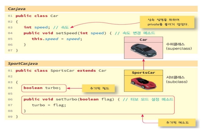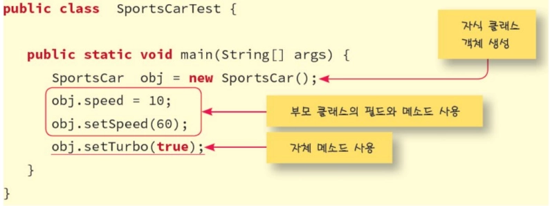Car 클래스를 상속받은 SportsCar 클래스는 부모 클래스의 필드 (speed)와 메소드(setSpeed)를 활용할 수 있다.