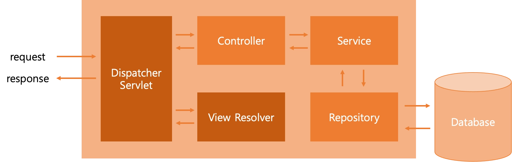 앞서 살펴봤던 그림에서, DispatcherServlet 이라는 Spring의 일부가 사용자의 요청이 어디로 전달되어야 할지 정해서 전달한다고 이야기 하였습니다. 이때 실제 그 요청을 전달받는 Controller 와 그 안쪽의 RequestMapping (URL 경로에 연결하는 함수)으로 요청을 전달하게 되는데, 이 부분은 개발자가 작성하게 됩니다. 즉, Spring을 이용한 개발에서는, 추상화된 사용자의 요청을 처리하는 클래스와 함수를 정의하면 이미 만들어진 Spring Framework에서 해당 코드를 가져다 사용한다고 볼 수 있습니다.